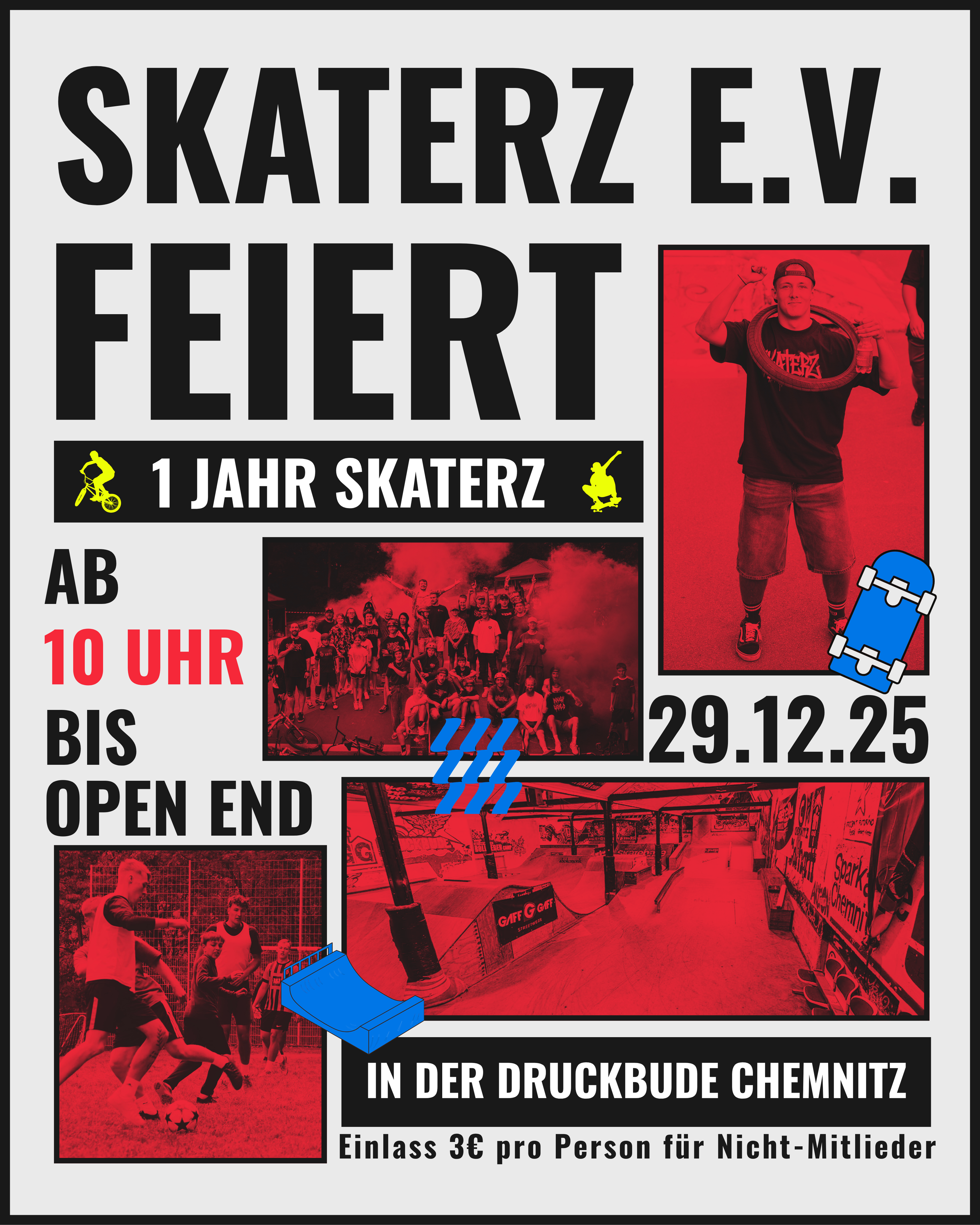 Nach einem erfolgreichen erstem Jahr als Skaterz e.V. veranstalten wir am 29.12.2025 einen Jahresabschluss in der Druckbude Chemnitz. Jeder ist herzlich Willkommen.